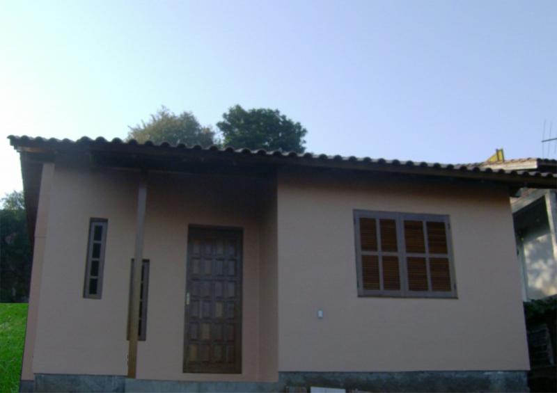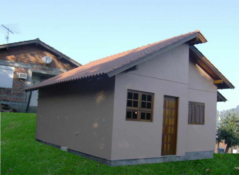 Casa de alvenaria construída pela Objetiva Casas, com quarto casal, quarto solteiro, banheiro, sala, copa e cozinha integralizados.